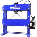 The 100-ton (980 kN) motorized Workshop Press from RHTC Profi Press is the same machine as our 100-ton standard machine except that it has a working width of 1500 mm wide for those larger pressing operations. The working table is adjustable to 6 positions in 150 mm increments with the easy-to-use cylinder chain hoist system. The primary cylinder is a top-quality double-acting (dual-acting) cylinder.