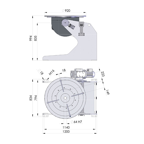 Models in the series D653 are Extra-Heavy Duty Welding Positioners are tiltable in a range of 135°. Due to the size and load capacity, the tilting movement is motorized or hydraulic and can be controlled directly at the turntable or via a remote control. The models D653 offer an interchangeable faceplate via a unique locking system that allows the faceplate to be quickly released for fast setup and changeovers.