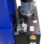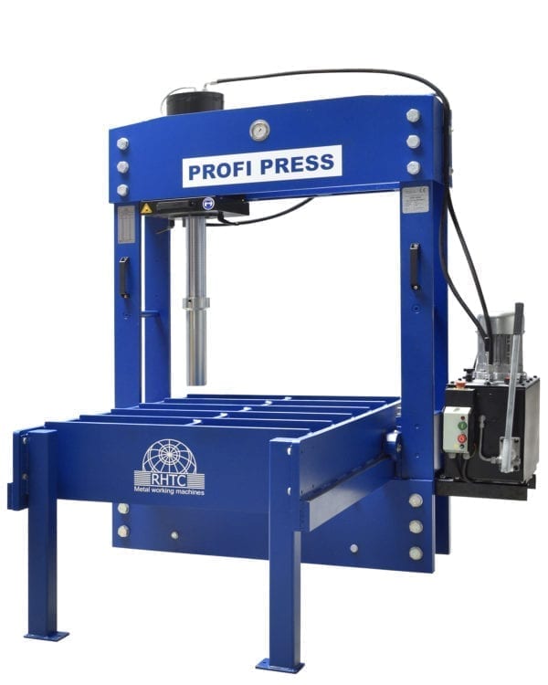 The press is equipped with an integrated pressure manometer, pressure regulation, and a hydraulic unit with two-speed options to accommodate various processing needs. It also features a joystick/directional control valve for cylinder movement and a hand pump for precise press work, allowing fine control during critical operations.