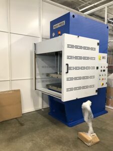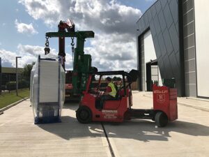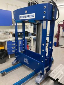 100 Ton hydraulic Workshop Press being moved into location in a laboratory In the back corner – special installation of a hydraulic press.