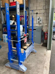 100 ton workshop press head and cylinder in disassembled state prepped to be moved into location in a customer's laboratory