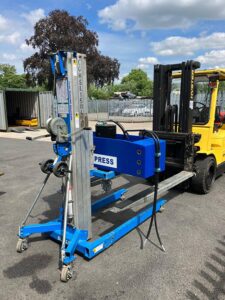 200 Ton Hydraulic C Frame press in horizontal position being put upright with a versa lift and hiab.