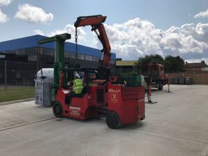 200 Ton C Press on the back of a lorry being off lifted in a horizontal position to the pavement for up-righting.