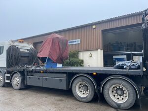 50 ton C frame press on the back of a lorry after being loaded with a hiab and secured for transport with cover to prevent from weather.