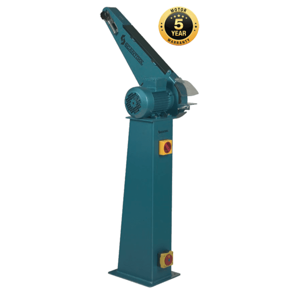 The SCANTOOL 1600 Industrial Belt Grinder is a powerful and reliable machine designed for demanding grinding tasks in workshops and industrial environments. Featuring a robust 1.5 HP motor and a fixed belt arm, this grinder ensures consistent performance and precision. The machine includes an adjustable tool rest, a grinding surface table with a graphite pad, and a front tool rest, providing an optimal working position for various applications. Ideal for surface grinding, this pedestal-mounted grinder is built to enhance productivity and efficiency in metal fabrication and manufacturing settings.