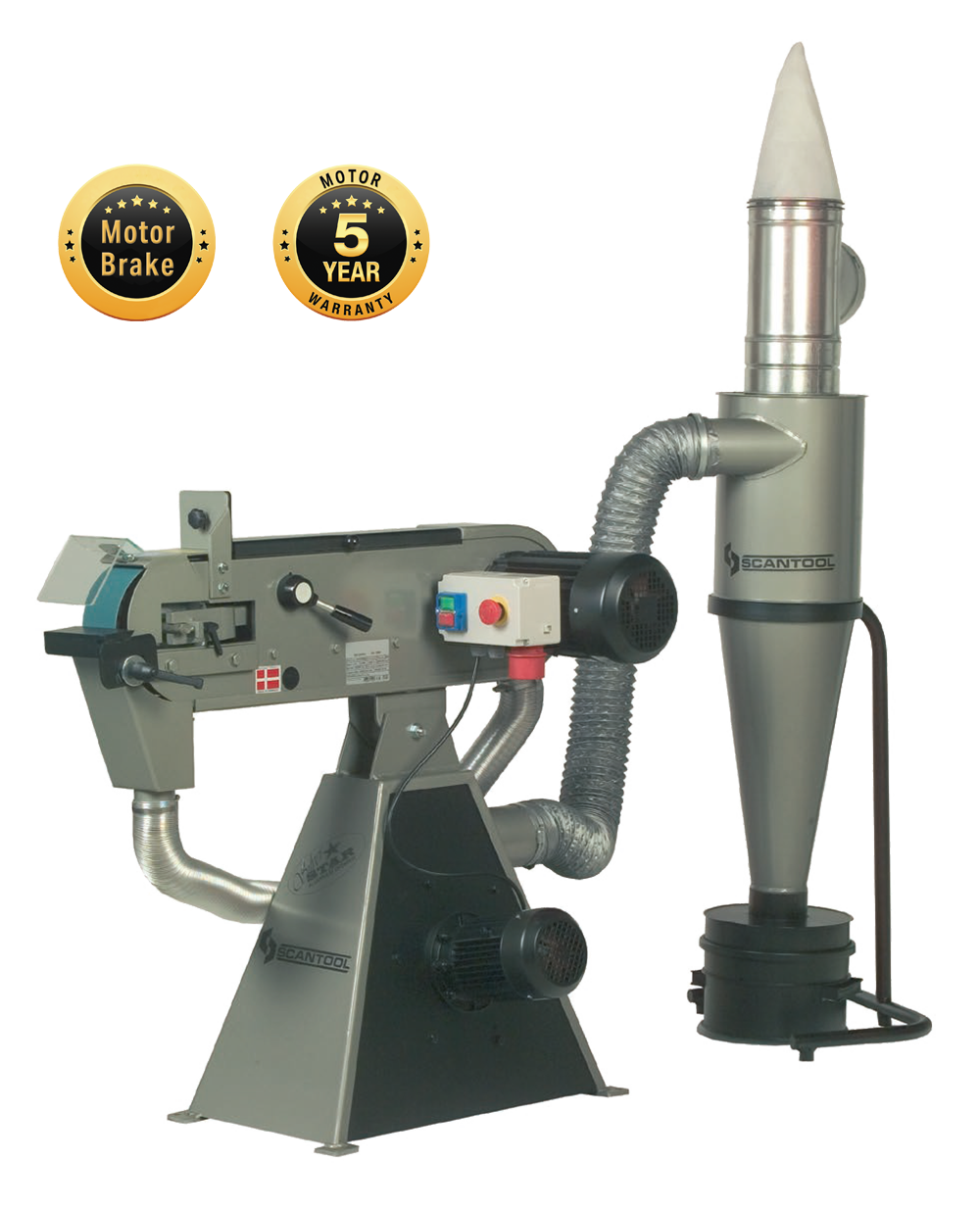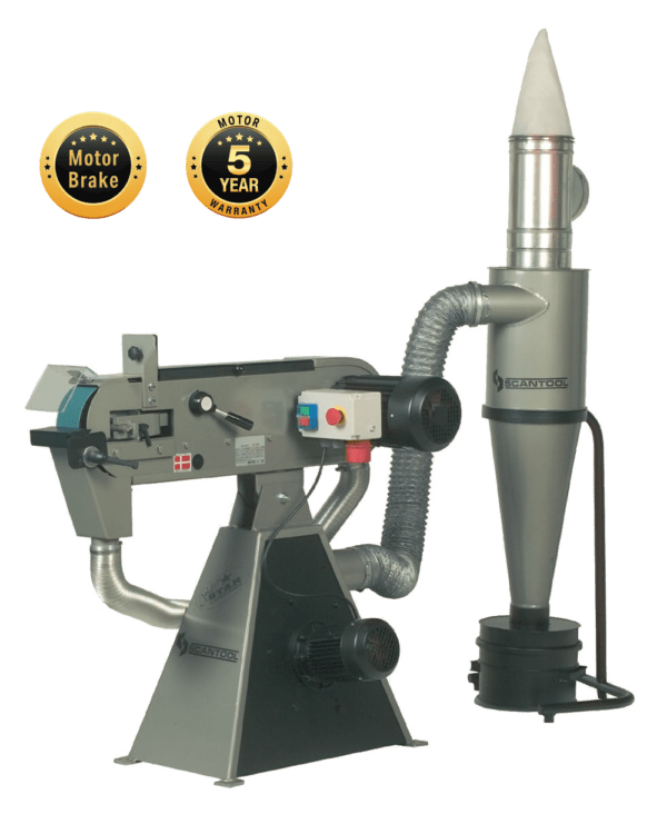 The SCANTOOL 75X SILVERSTAR Belt Grinder, designed for aluminum and non-spark metals, features a 4.1 HP motor, built-in exhaust system, and unparalleled safety. CE Certified and EU Built.