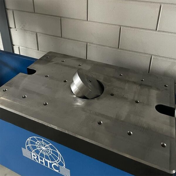 Work table for 30 Ton Motorised Workshop Press that can be used to mount tools, jigs, fixtures has 16x M12 mounting holes and a large centre hole that is 100 mm in diameter that can be used in conjunction with tools to expel swarf and slugs or can be used as a locating hole for tools.